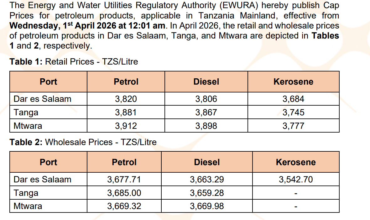 Motorists and other fuel consumers in Tanzania will pay around Sh1,000 more for a litre of petrol after the energy regulator revised cap prices for April 2026 in response to rising global prices precipitated by the US-Israeli war on Iran.
