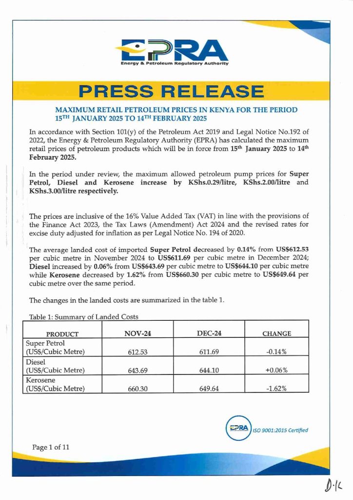 Energy and Petroleum Regulatory Authority (EPRA) has announced an increase in prices for Super Petrol, Diesel, and Kerosene effective January 15 to February 14, 2025.