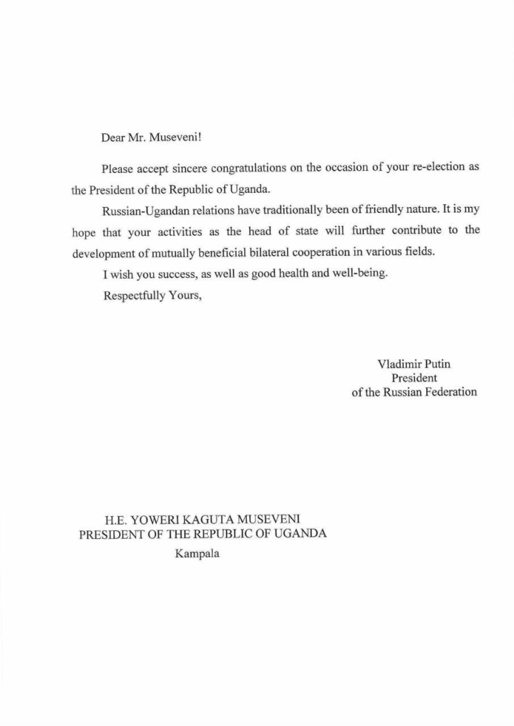 In a message addressed to President Museveni, President Putin conveyed his best wishes and acknowledged Uganda’s electoral process, noting the longstanding cordial relations between the two countries.