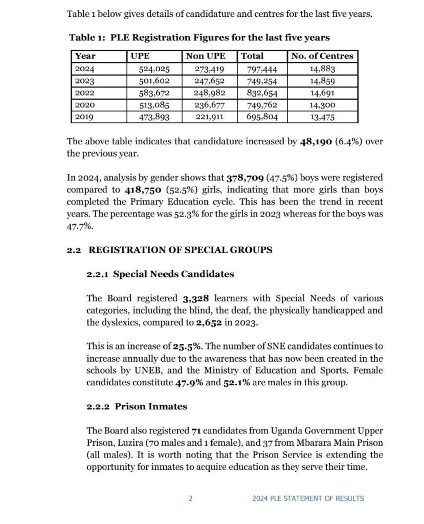According to Uganda National Examinations Board (UNEB), executive Director Dan Odongo, “A total of 797,444 candidates from 14.883 centres (schools) registered for PLE in 2024 compared to 749,347 in 2023. Of this number, 524,025 (65.7%) from 11,451 centres were Universal Primary Education (UPE) beneficiaries while 273,419 (34.3%) of the candidates from 3,432 centres were Non UPE”.