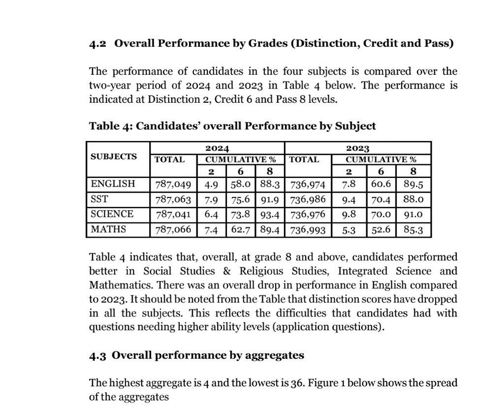 Overall Performance by Grades (Distinction, Credit and Pass) The performance of candidates in the four subjects is compared over the two-year period of 2024 and 2023 in Table 4 below. The performance is indicated at Distinction 2, Credit 6 and Pass 8 levels.