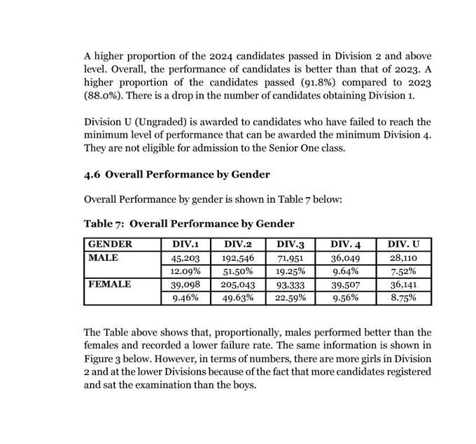 PLE results indicated that 45,203 boys (12.09%) passed in division one, 192,546(51.50%) in division two, 71,951(19.25%) in division three and 36,049(9.64%) in division four.